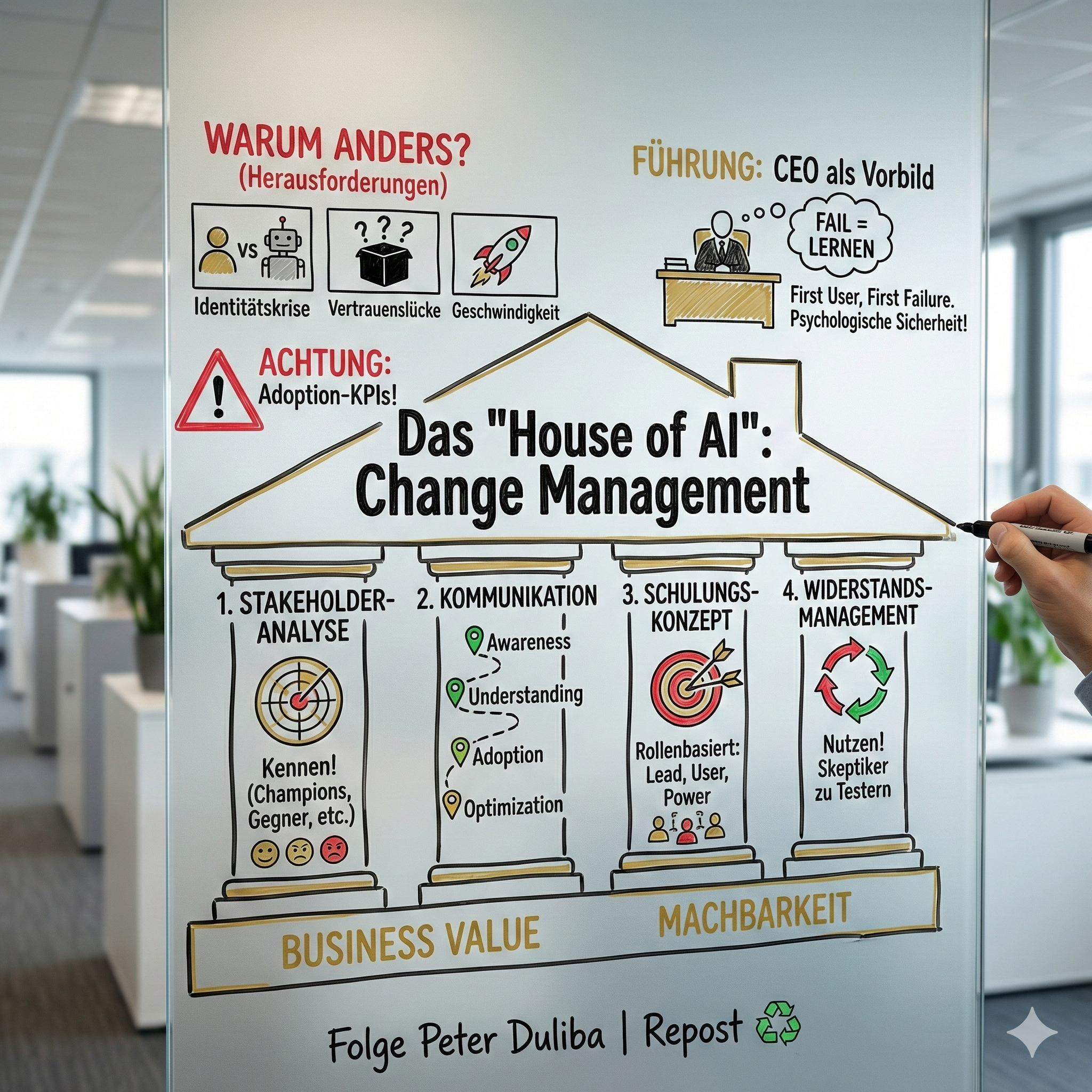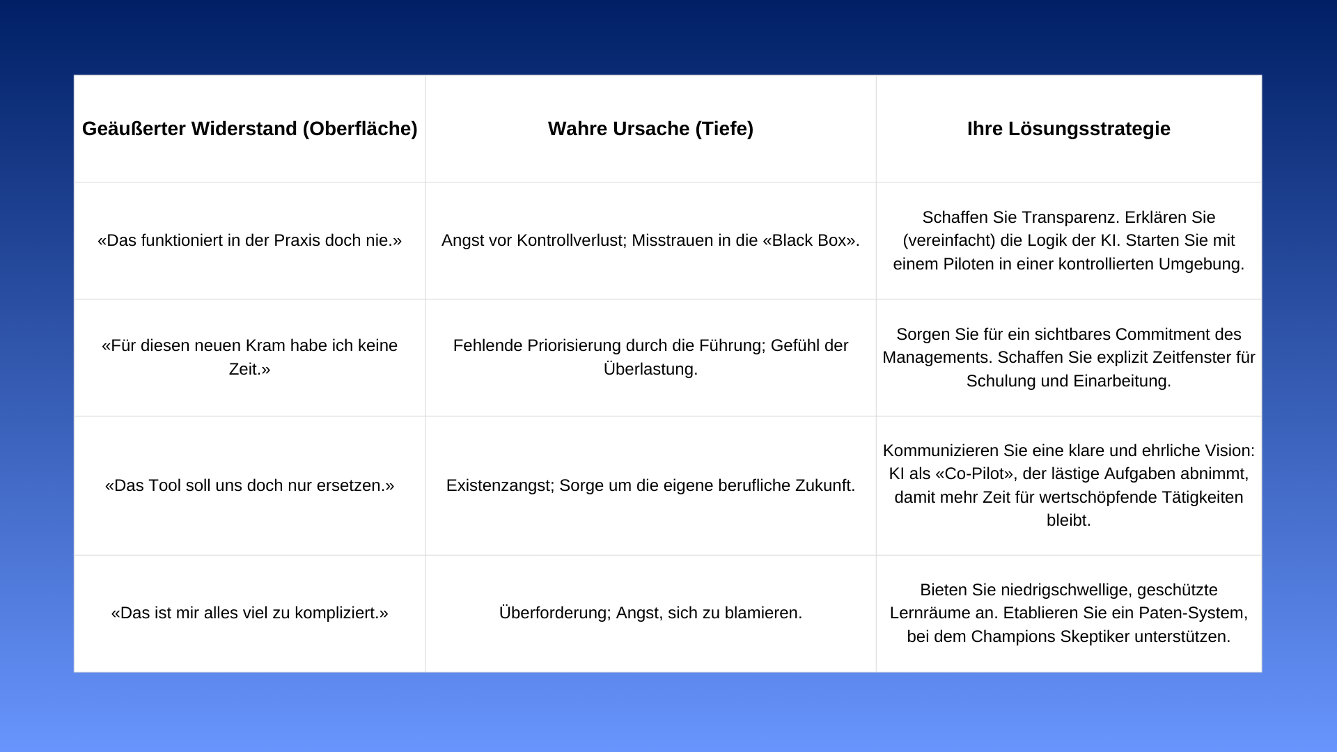 WICHTIG: Viele Mitarbeiter scheitern nicht am Tool, sondern am Verständnis von Basis-Kompetenzen. Change Management muss hier eine Bildungs-Offensive für KI-Grundkompetenz beinhalten.